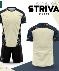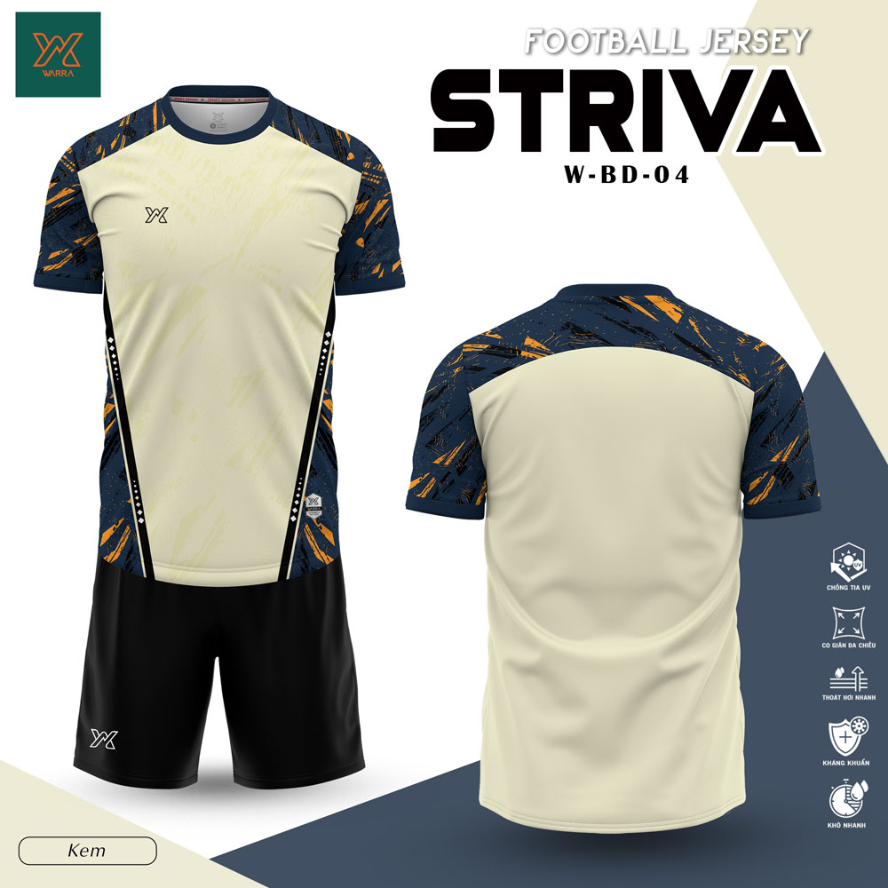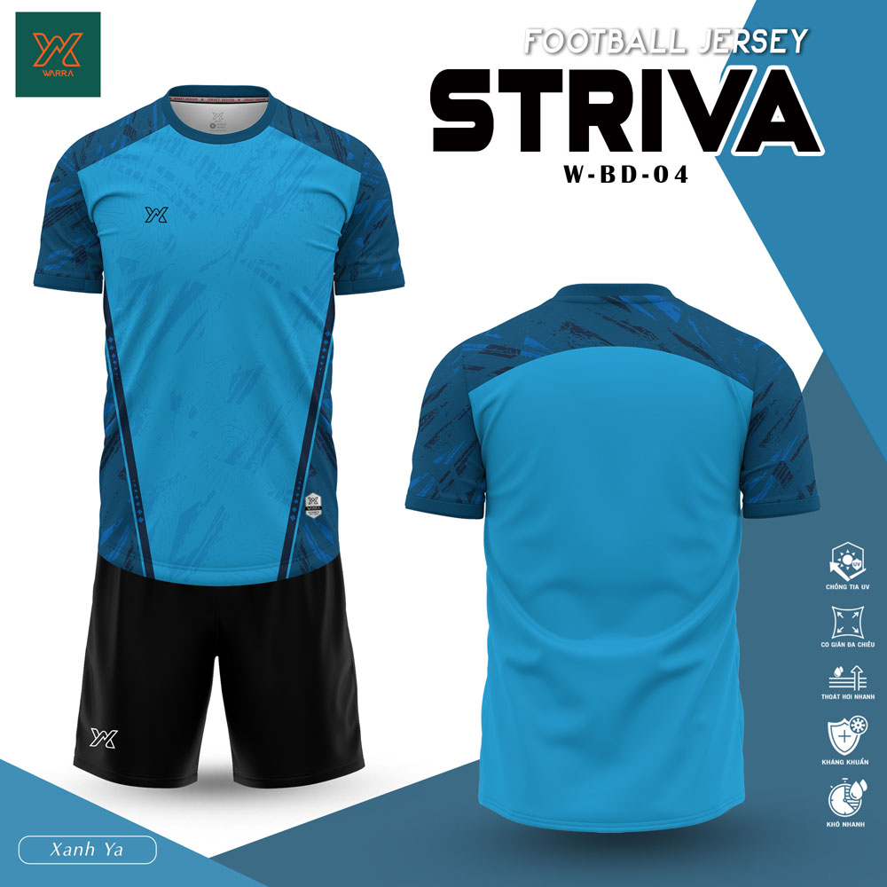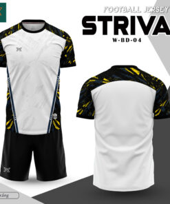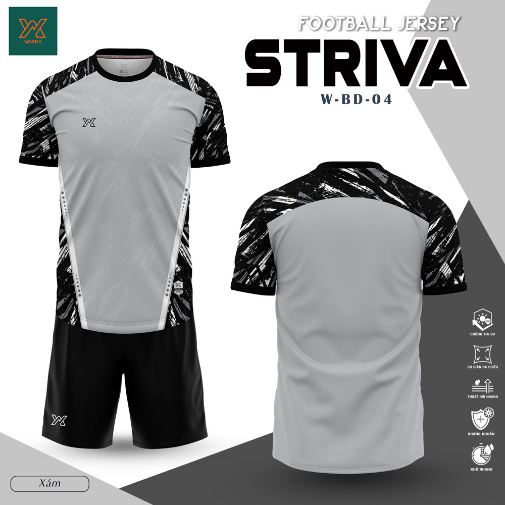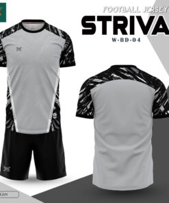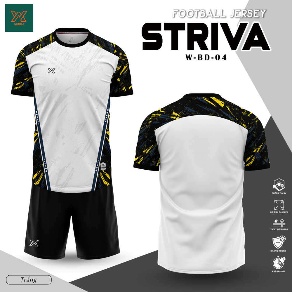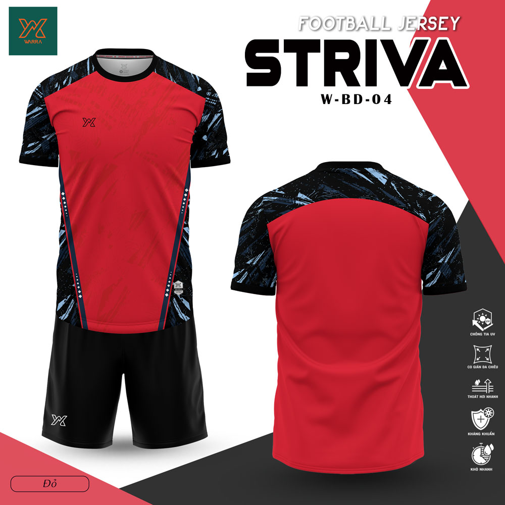 Áo bóng đá STRIVA W-BD-04 màu đỏ mang thiết kế mạnh mẽ, phối sắc đen trắng cá tính cùng chất liệu co giãn 4 chiều, chống tia UV – lựa chọn lý tưởng cho mọi trận cầu.