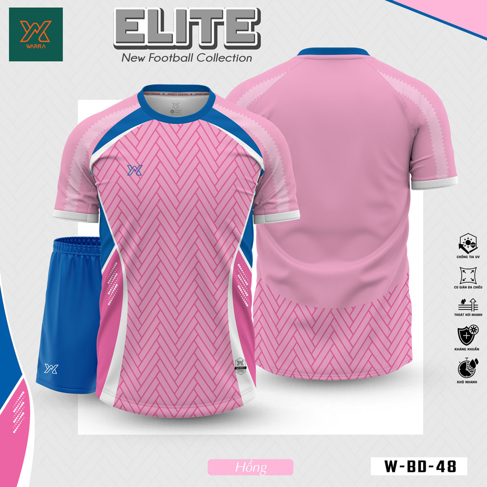 Mẫu áo bóng đá Warra ELITE W-BD-48 nổi bật với màu hồng pastel chủ đạo, kết hợp cùng họa tiết chữ V phối sắc tạo hiệu ứng chuyển động tinh tế. Tông màu hồng nhẹ nhàng nhưng không kém phần mạnh mẽ, được viền bằng xanh dương, trắng và hồng đậm, đem đến tổng thể hài hòa, trẻ trung và đậm chất thể thao.