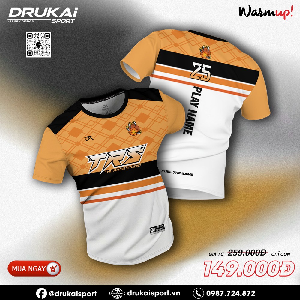 Áo Thể Thao TRS phối màu cam vàng – trắng – đen nổi bật với chất liệu vải co giãn, thấm hút tốt và thiết kế form ôm cá tính – phù hợp cho thi đấu, tập luyện và đồng phục nhóm thể thao.
