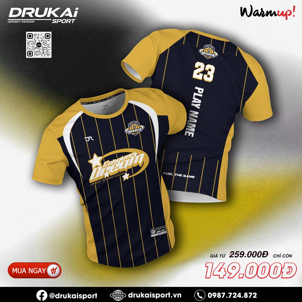 Áo thể thao unisex thiết kế hiện đại, phối màu xanh navy và vàng ánh kim nổi bật. Chất liệu cao cấp, co giãn, thoáng khí, thích hợp cho vận động mạnh. Phù hợp làm đồng phục đội nhóm với khả năng in tên + số áo theo yêu cầu.