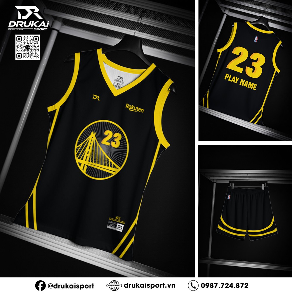 Bộ áo đấu thể thao với gam màu đen vàng chủ đạo, kết hợp họa tiết hình cầu cảng độc đáo mang đến phong cách mạnh mẽ, cá tính và chuyên nghiệp cho người mặc.
