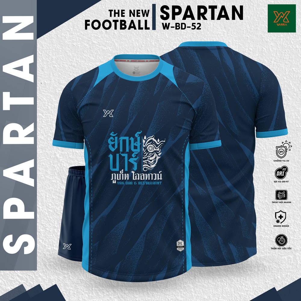 Bộ trang phục thi đấu SPARTAN W-BD-52 nổi bật với sự phối hợp giữa hai gam màu ấn tượng: xanh navy đậm – biểu tượng của sự vững vàng, rắn rỏi; và xanh dương sáng – đem lại nét trẻ trung, năng động. Họa tiết kẻ sọc trừu tượng tạo chiều sâu thị giác, giúp mỗi chuyển động trên sân thêm cuốn hút. Đây thực sự là thiết kế dành riêng cho những chiến binh đam mê trái bóng tròn.