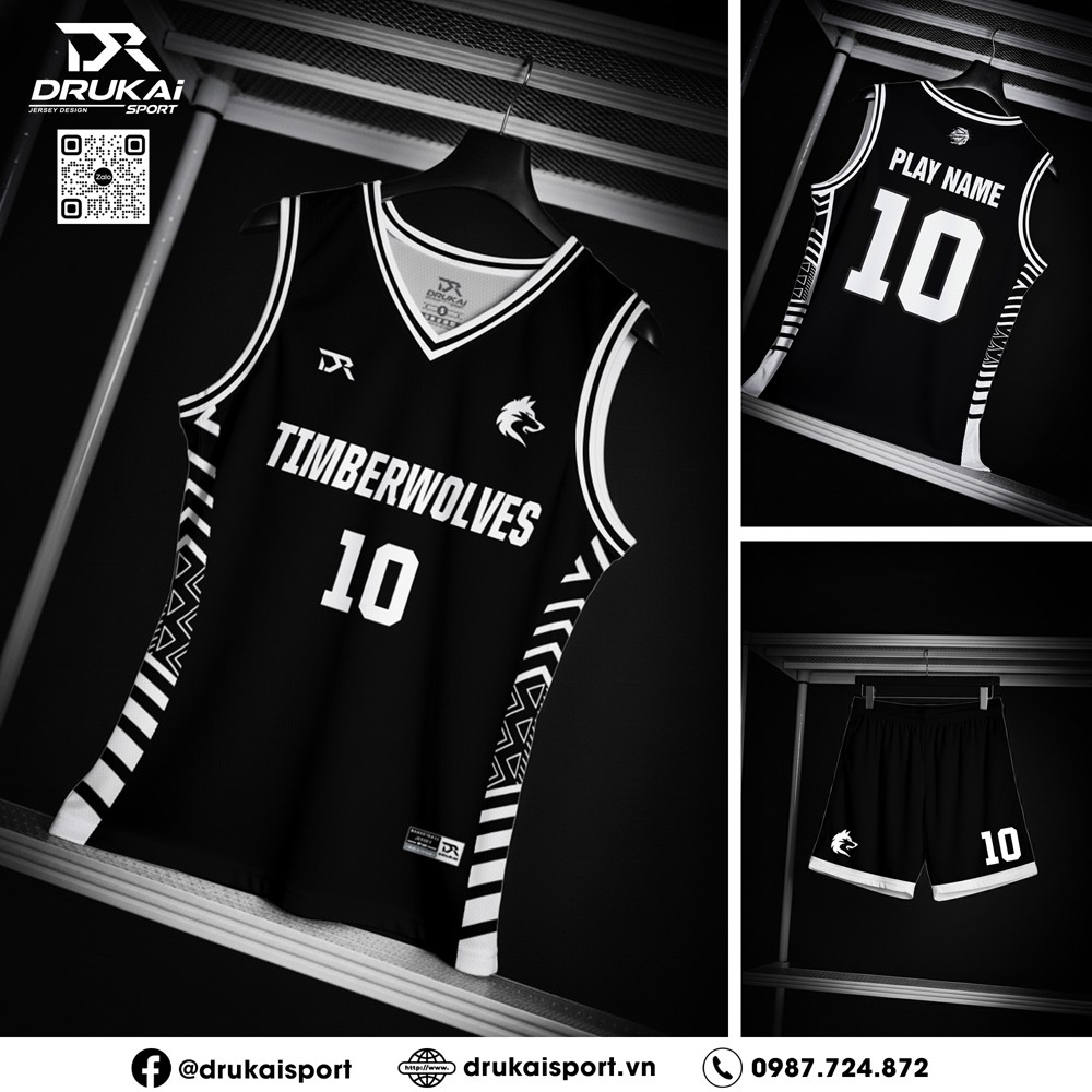 Màu đen chủ đạo giúp bộ đồng phục mang lại vẻ mạnh mẽ, huyền bí và quyền lực – rất phù hợp với tinh thần không khoan nhượng của môn bóng rổ. Những mảng trắng nổi bật trên nền đen dùng để thể hiện tên CLB “TIMBERWOLVES”, số áo, tên cầu thủ và logo không chỉ tăng tính nhận diện mà còn tạo nên hiệu ứng tương phản cao, giúp người xem dễ dàng nhìn thấy từ xa.